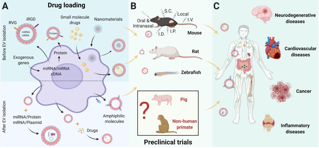 During the past decades, extracellular vesicles (EVs) have emerged as an attractive drug delivery system. In this review, the pre-clinical applications of EVs were accessed. Based on the trend observed from study published over the past decade, we have define the niches where to apply EVs for drug delivery in the future and to provide a basis for regulatory guidelines.