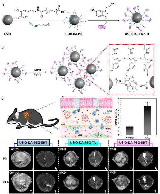 The diagnosis of nonalcoholic steatohepatitis (NASH) is important for preventing the progress of nonalcoholic fatty liver disease (NAFLD) into a fatal condition. Considering the expression of oxidative enzyme myeloperoxidase (MPO) which is a key player in lipid peroxidation in inflamed tissues, was much higher in NASH than in the nonalcoholic fatty liver (NAFL) with steatosis, we designed a nanoparticle platform based on ultrasmall iron oxide (USIO) nanoparticles to realize MPO-sensitive NASH diagnosis. These USIO-DA-PEG-5HT nanoprobes offer great potential for improving NASH MR imaging diagnostic accuracy and sensitivity compared to existing molecular MR contrast agents with a single imaging modality.