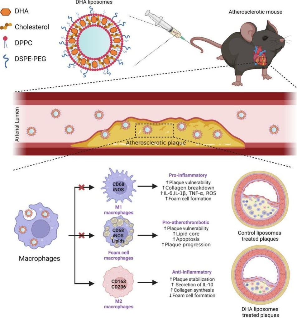 Docosahexaenoic acid (DHA, 22:6n-3), an omega-3 polyunsaturated fatty acid (PUFA), which exerts anti-inflammatory and antioxidant properties, has long been purported to be of therapeutic benefit to atherosclerosis patients. However, large clinical trials have yielded inconsistent data, likely due to variations in the formulation, dosage, and bioavailability of DHA following oral intake. To fully exploit its potential therapeutic effects, we have developed an injectable liposomal DHA formulation intended for intravenous administration as a plaque-targeted nanomedicine. The liposomal formulation protects DHA against chemical degradation and increases its local concentration within atherosclerotic lesions.